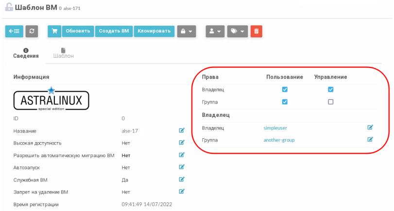 В представленном примере в отношении шаблона 0 владелец simpleuser имеет полномочия типа USE и MANAGE. Пользователи в группе another-group имеют полномочия типа USE, другие пользователи не имеют полномочий в отношении данного шаблона.