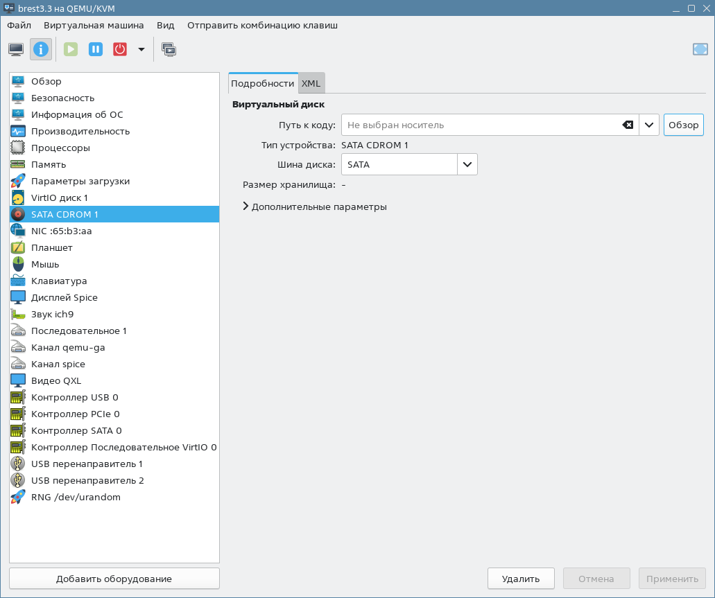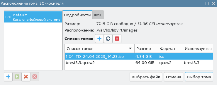Файл образа установочного носителя предварительно должен быть скопирован в пул хранилища (по умолчанию /var/lib/libvirt/images).