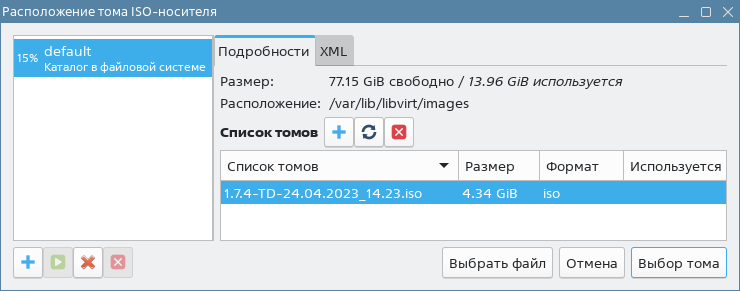Файл образа установочного носителя предварительно должен быть скопирован в пул хранилища (по умолчанию /var/lib/libvirt/images).
