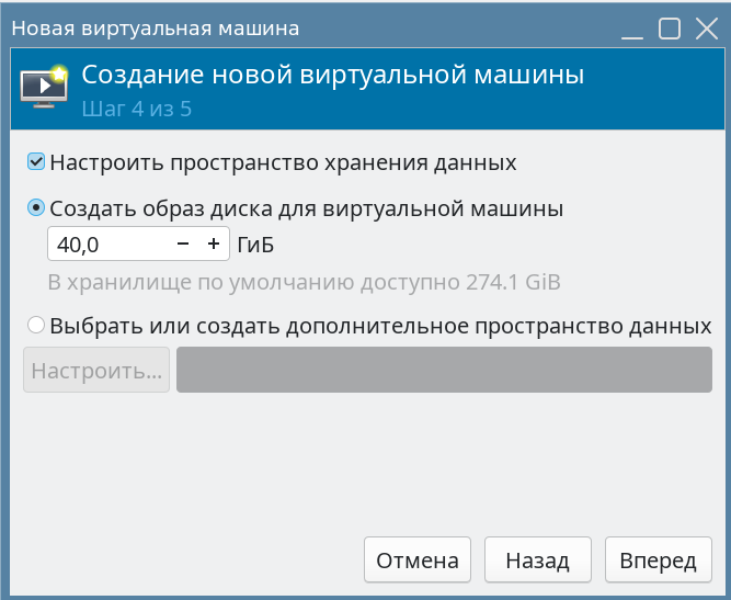 - В окне Создание новой виртуальной машины (шаг 4 из 5) задать размер диска гостевой машины и нажать на кнопку Вперед.