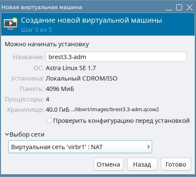 172.17.1.2— IP-адрес развернутого сервера ПК СВ, заданный во время выполнения действий по настройке сети;FN.brestadmin— сетевое имя гостевой машины сервиса виртуализации, заданное во время выполнения действий по настройке сети.