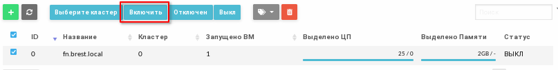 2. В веб-интерфейсе ПК СВ в меню слева выбрать пункт меню Инфраструктура — Узлы. На открывшейся странице Узлы выбрать обновленный узел и нажать кнопку Включить.