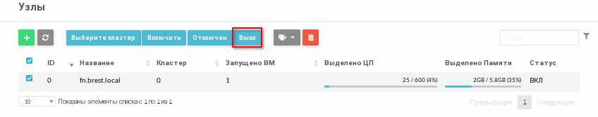 1. В веб-интерфейсе ПК СВ в меню слева выбрать пункт меню Инфраструктура — Узлы. На открывшейся странице Узлы выбрать обновляемый узел и нажать кнопку Выкл.