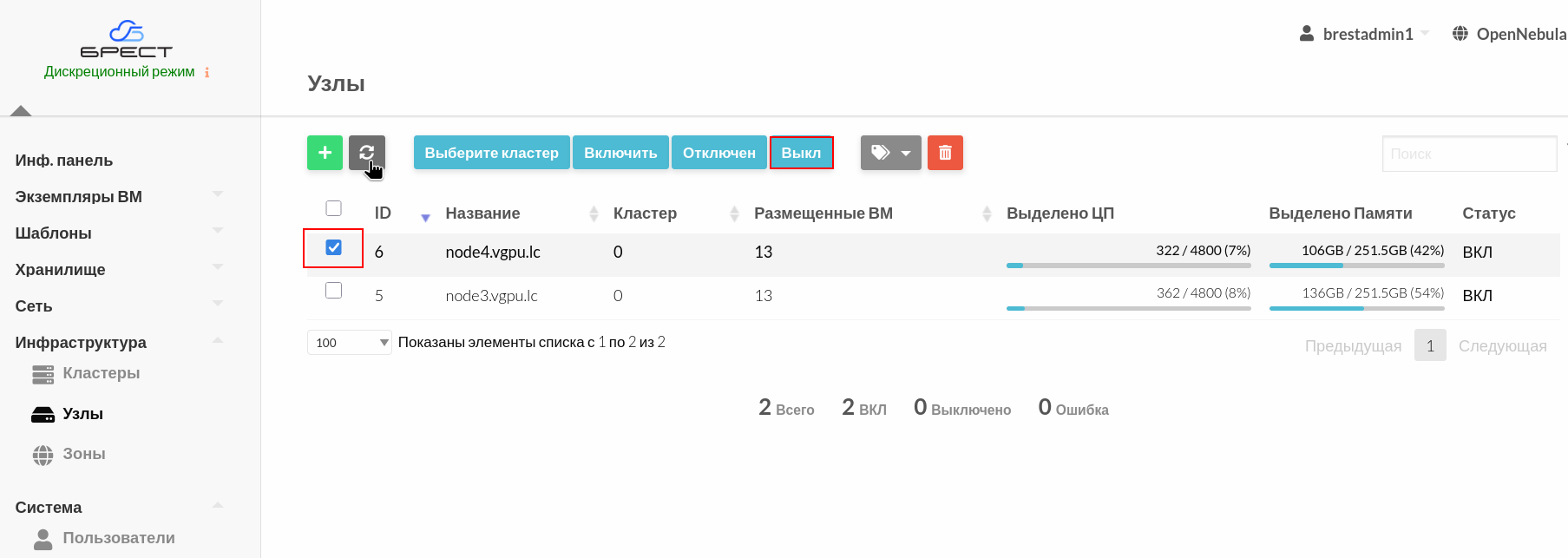 2. В открывшемся окне Узлы выбрать, планируемый к обновлению, сервер виртуализации и нажать кнопку Выкл:
