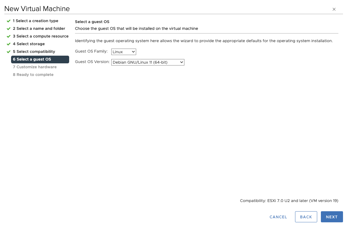 выбрать семейство ОС Linux и версию ОС, соответствующую 64-битной версии, и нажать экранную кнопку [NEXT];