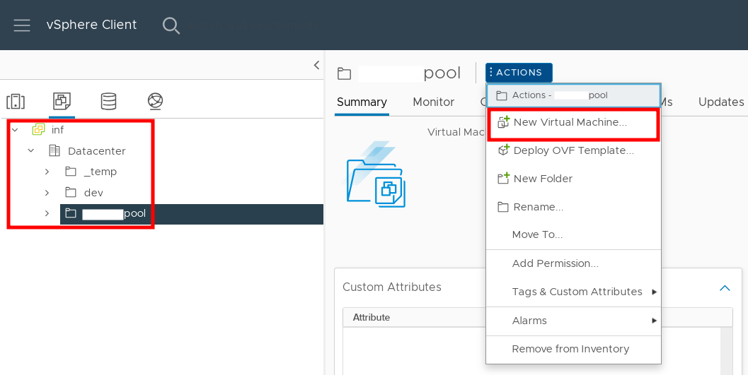 в веб-интерфейсе VMware vSphere Client выбрать хост и пул ресурсов, в котором будет создана новая ВМ, затем нажать экранную кнопку [Actions] и выбрать пункт «New Virtual Machine...»;