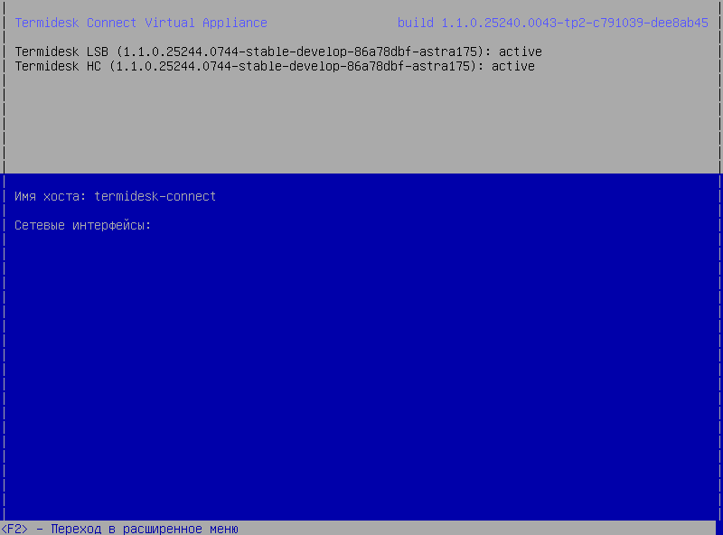 - выбрать в меню пункт «Virtual Appliance Termidesk Connect» (по умолчанию) и нажать клавишу <ENTER>;