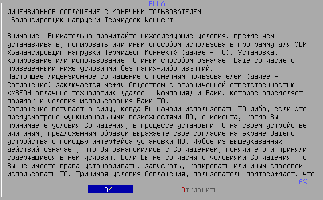 - прочитать и принять условия лицензионного соглашения, переключившись на экранную кнопку [ОК] и нажав клавишу <ENTER>;