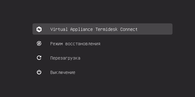 - дождаться автоматического выбора варианта загрузки. Если в период таймера нажать любую клавишу, то таймер остановится, нужно будет выбрать пункт «Virtual Appliance Termidesk Connect» и нажать клавишу <ENTER>;