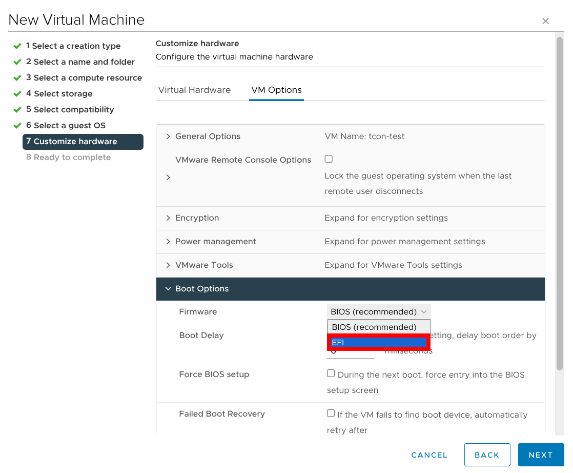 - перейти во вкладку «VM Options» и указать для параметра «Boot Option» значение «EFI»;