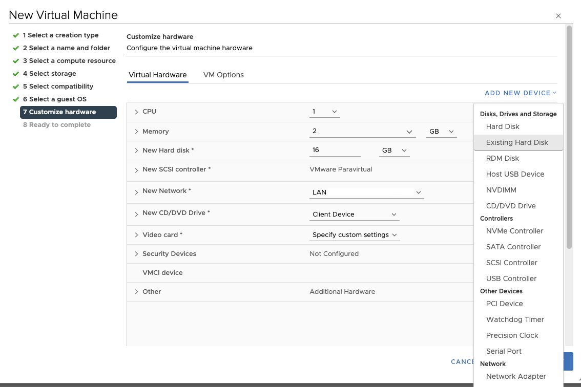 - в параметрах ВМ необходимо добавить существующий диск и указать образ диска Termidesk Connect формата