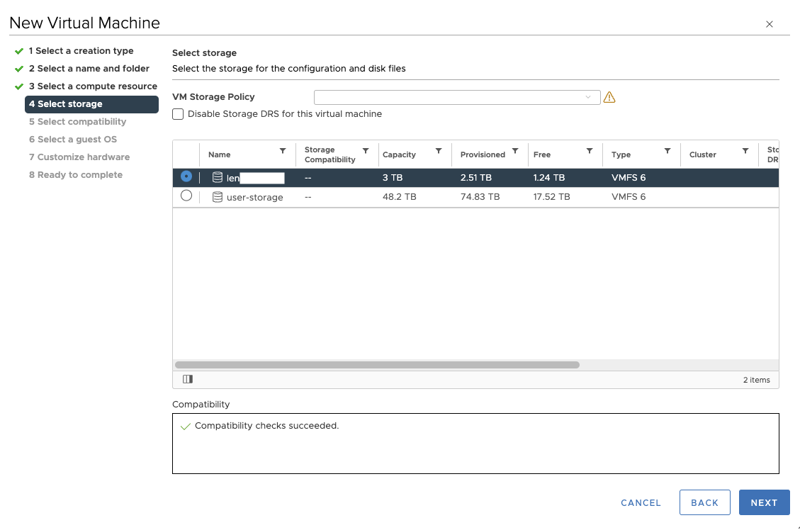 - выбрать хранилище для размещения ВМ и нажать экранную кнопку [NEXT];