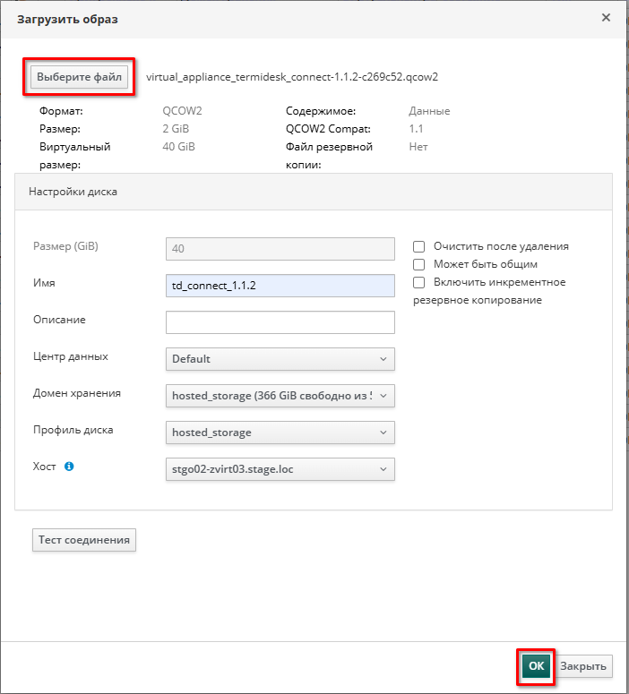 .qcow2, далее нажать экранную кнопку [ОК] и дождаться загрузки образа диска;