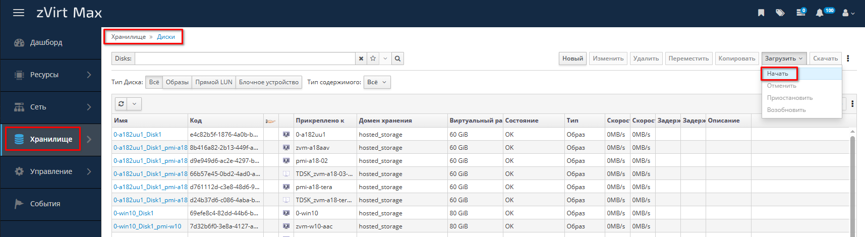 - в веб-интерфейсе zVirt MAX перейти в раздел «Хранилище – Диски», далее нажать экранную кнопку [Загрузить] и выбрать элемент раскрывающегося списка «Начать»;