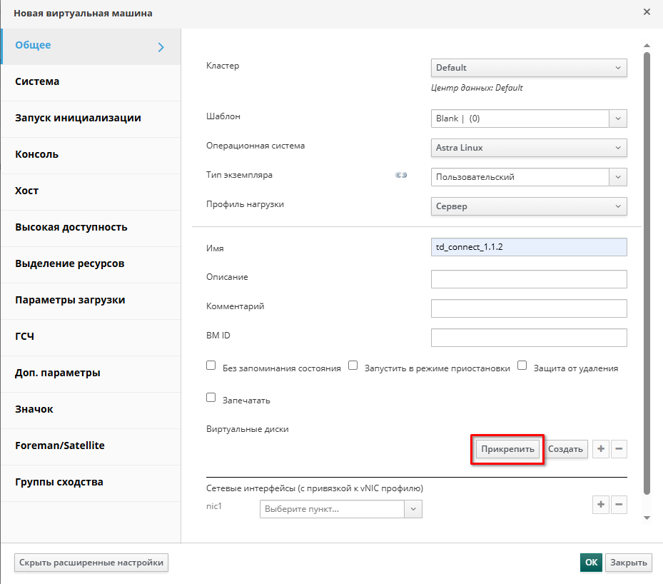 - в открывшемся окне «Новая виртуальная машина» (раздел «Общее») указать необходимые параметры, далее в области «Виртуальные диски» нажать экранную кнопку [Прикрепить];
