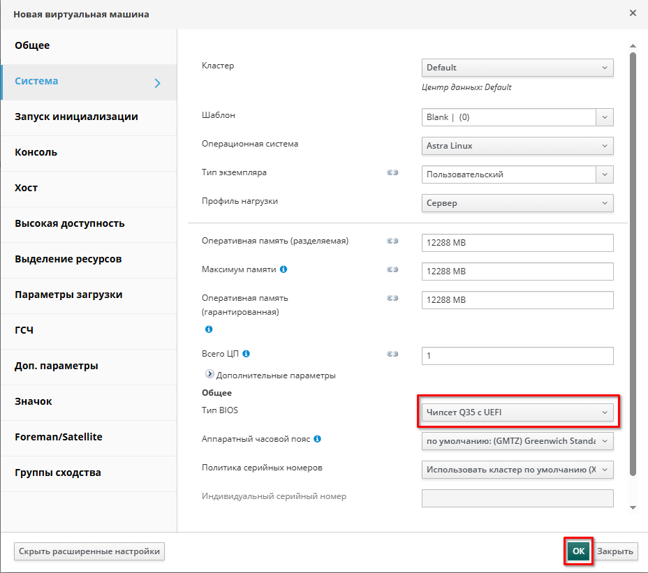 - перейти в раздел «Система», далее в раскрывающемся списке «Тип BIOS» выбрать «Чипсет Q35 с UEFI» и нажать экранную кнопку [ОК];