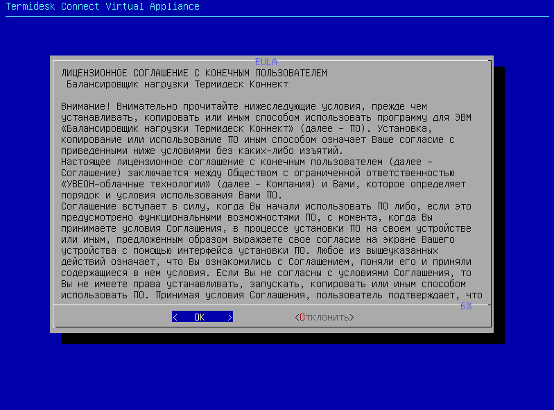 - прочитать и принять условия лицензионного соглашения, для этого переключиться на экранную кнопку [ОК] и нажать клавишу<ENTER>;
