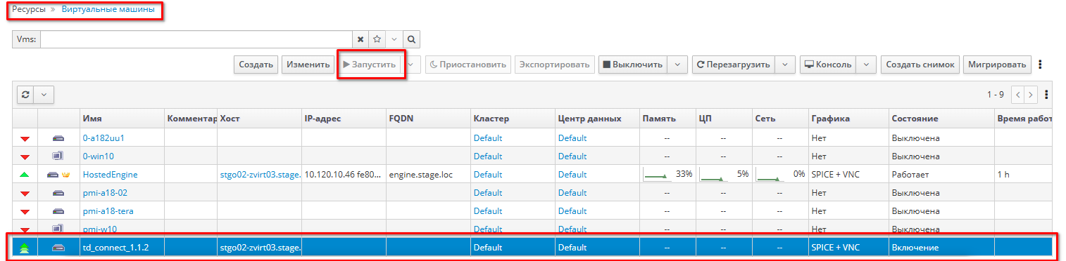 - в разделе «Ресурсы – Виртуальные машины» выбрать строку с ВМ Termidesk Connect и нажать экранную кнопку [Запустить].