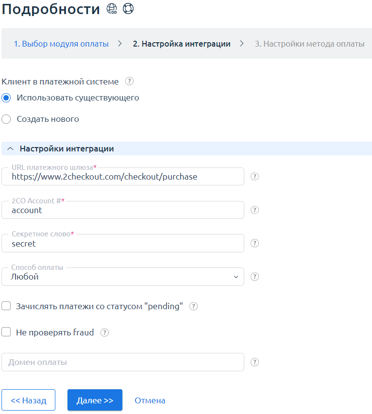 Для использования модуля оплаты 2CheckOut необходимо выполнить настройки на стороне платежной системы и подключить модуль в BILLmanager.