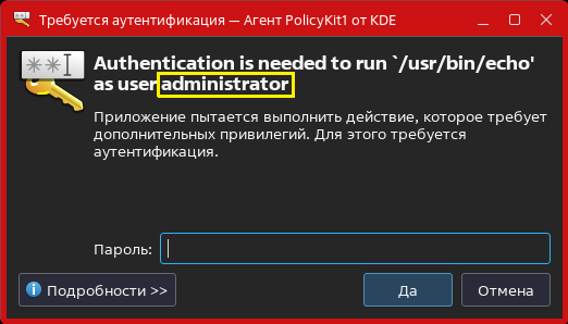 Рисунок 4. Окно агента аутентификации polkit-kde-authentication-agent-1. Подробности