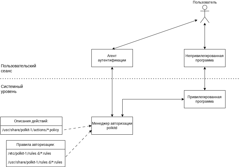 При получении запроса от пользователя привилегированная программа обращается к менеджеру авторизации – системной службе polkitd. Менеджер авторизации решает – можно ли выполнить действие, запрошенное пользователем. Если менеджер авторизации разрешил, то привилегированная программа выполняет действие, запрошенное пользователем.