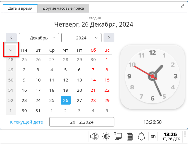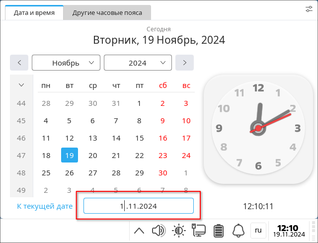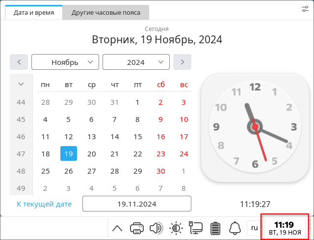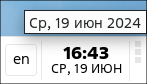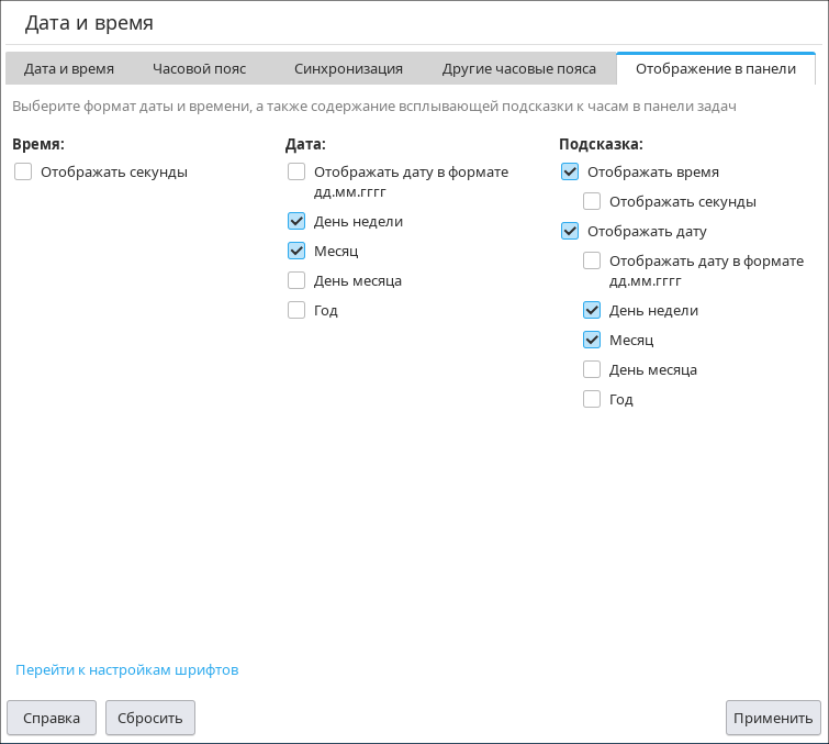 Если дата на панели задач не отображается, то причиной этого может быть слишком крупный шрифт даты. Чтобы изменить шрифт даты, необходимо во вкладке Отображение в панели нажать на ссылку «Перейти к настройкам шрифтов» — будет запущена программа «Оформление Fly», в которой необходимо изменить размер шрифта даты (см. справочную страницу Оформление Fly). Перейти к настройкам шрифтов также можно через панель задач — вызвать контекстное меню часов и выбрать Изменить шрифт.