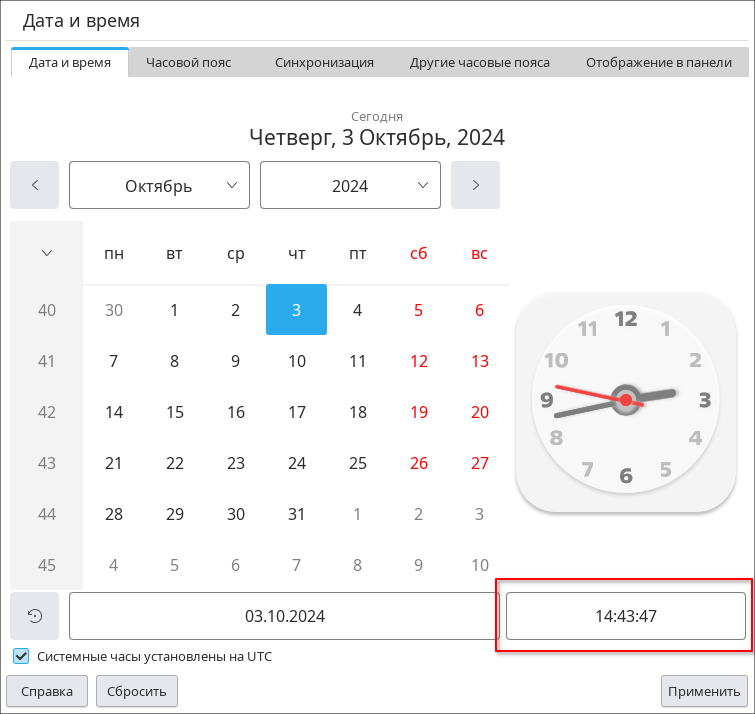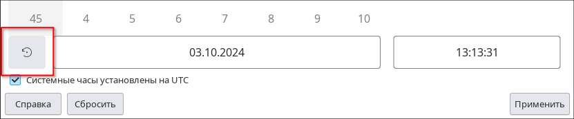 - по умолчанию системные часы учитывают смещение часового пояса (см. Текущий часовой пояс). Если нужно отображать время без смещения часового пояса, то снять флаг Системные часы установлены на UTC;