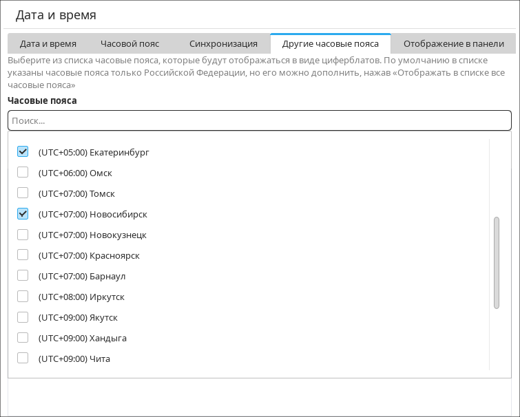 - в поле списка Часовые пояса начать вводить название столицы или крупного города, находящегося в этом часовом поясе: для поиска городов Российской Федерации использовать кириллицу, других городов — латиницу. Из предложенных вариантов установкой флага выбрать нужный часовой пояс;
