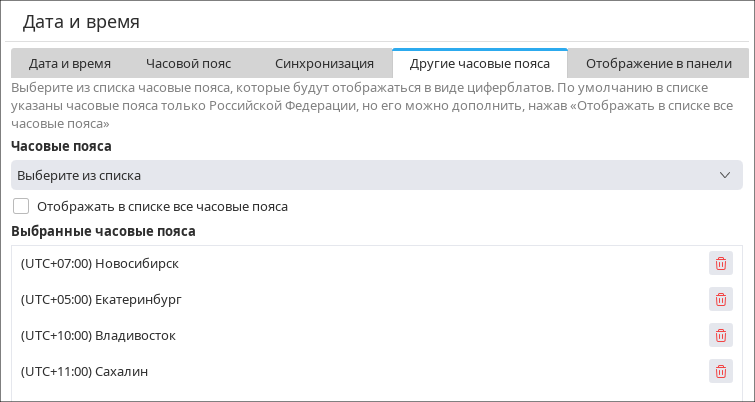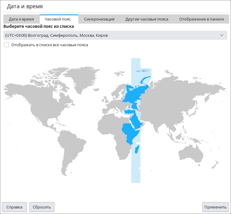 Примечание. Если нужный часовой пояс находится в пределах Российской Федерации, то можно ограничить список часовых поясов, сняв флаг Отображать в списке все часовые пояса;