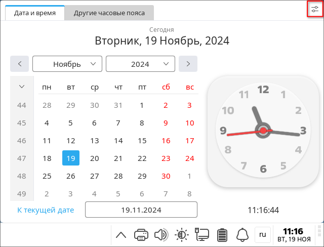 Любой пользователь может изменять формат отображения даты и времени и настраивать отображение времени в других часовых поясах. Для изменения даты, времени и других настроек требуется ввод пароля администратора. Если включен мандатный контроль целостности, то необходимо войти в сессию администратора с высоким уровнем целостности.