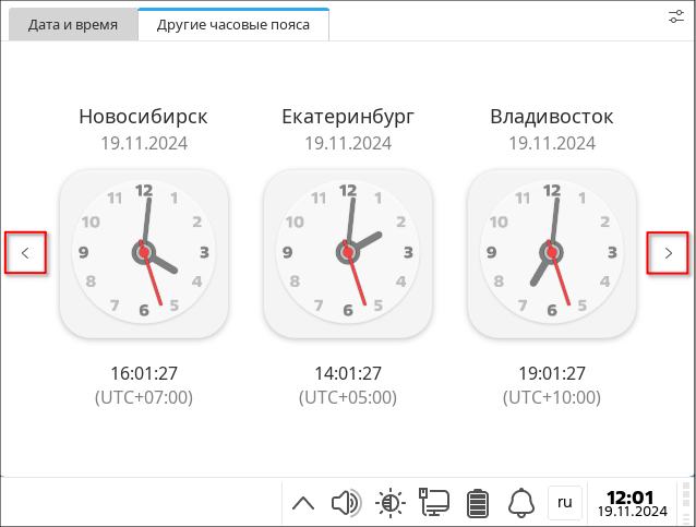 На панели задач отображаются дата и время только в текущем часовом поясе. В календаре на рабочем столе доступна вкладка Другие часовые пояса, в которой можно отображать дату и время в других часовых поясах. Для каждого часового пояса также отображается название крупного города в этом часовом поясе и смещение часового пояса. Единовременно отображается не более трех часовых поясов. Если часовых поясов больше, то для их просмотра следует воспользоваться кнопками [<] и [>].