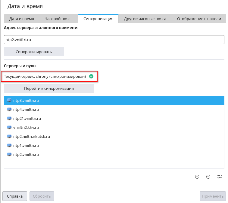 После запуска службы синхронизации в модуле «Дата и время» во вкладке Синхронизация будут отображены: