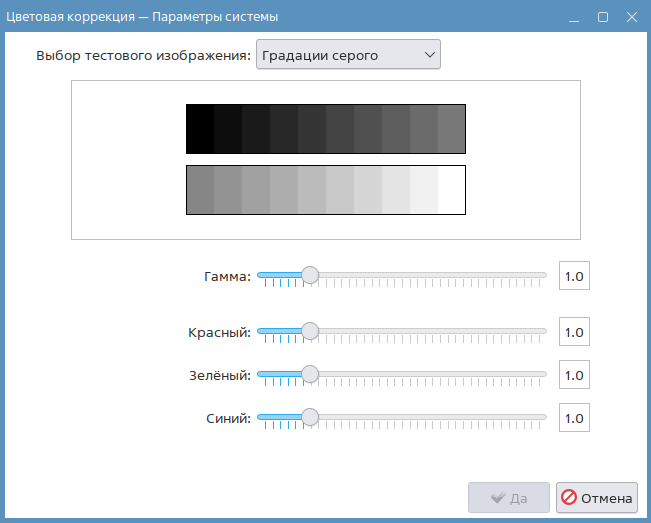 - из выпадающего списка Выбор тестового изображения выбрать цветовую схему тестового изображения (градации серого, RGB, CMY и другие).