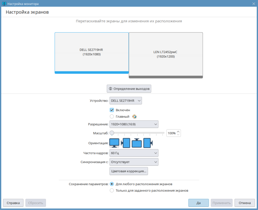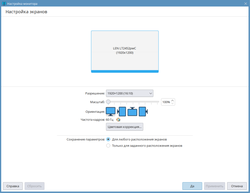 - Только для заданного расположения экранов — сохранить заданные параметры только для текущего расположения экранов (например, если поменять экраны местами, то будут установлены настройки, не зависящие от расположения экранов);
