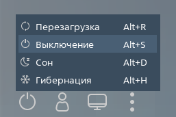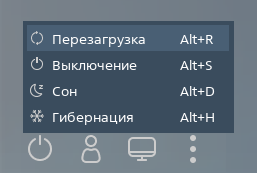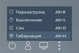 Для перехода в режим гибернации необходимо на экране входа или на экране блокировки нажать комбинацию клавиш <Alt+H> или раскрыть меню Выключение и выбрать Гибернация.