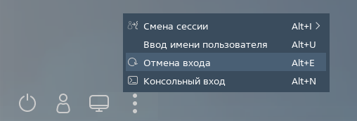 Чтобы отказаться от входа в новую сессию и вернуться на экран блокировки предыдущей сессии, необходимо на экране входа в новую сессию нажать комбинацию клавиш <Alt+E> или раскрыть меню Особое действие и выбрать Отмена входа.