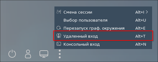 Для просмотра перечня компьютеров, доступных для подключения, необходимо на экране входа нажать комбинацию клавиш <Alt+T> или раскрыть меню Особое действие и выбрать Удаленный вход.