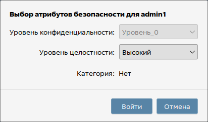 Если в системе включены мандатный контроль целостности (доступен на усиленном и максимальном уровнях защищенности) и/или мандатное управление доступом (доступно на максимальном уровне защищенности), а также учетной записи заданы атрибуты безопасности (уровень и категория конфиденциальности, уровень целостности), то после ввода логина и пароля будет открыто окно для выбора значений атрибутов безопасности сессии. Данные атрибуты назначаются администратором с помощью модулей «Мандатный контроль целостности» и «Мандатное управление доступом» программы «Параметры системы» (см. справочные страницы Мандатный контроль целостности и Мандатное управление доступом).