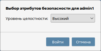 ВНИМАНИЕ! Входить в систему с высоким уровнем целостности следует только привилегированному пользователю (администратору) для выполнения настроек системы. Для обычного (штатного) режима работы рекомендуется входить в систему с низким (нулевым) уровнем целостности.