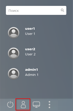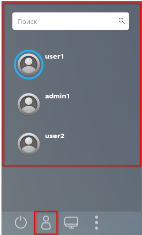 Для переключения на активную сессию другой учетной записи необходимо на экране входа или на экране блокировки нажать [Список пользователей] и выбрать нужную учетную запись из отобразившегося списка. При этом будет выполнен переход на экран блокировки другой сессии (см. Блокировка и разблокировка сессии).