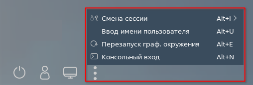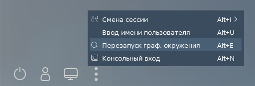 Для перезапуска графического окружения (например, при некорректном отображении или сбоях в работе экрана входа) необходимо на экране входа нажать комбинацию клавиш <Alt+E> или раскрыть меню Особое действие и выбрать Перезапуск граф. окружения.