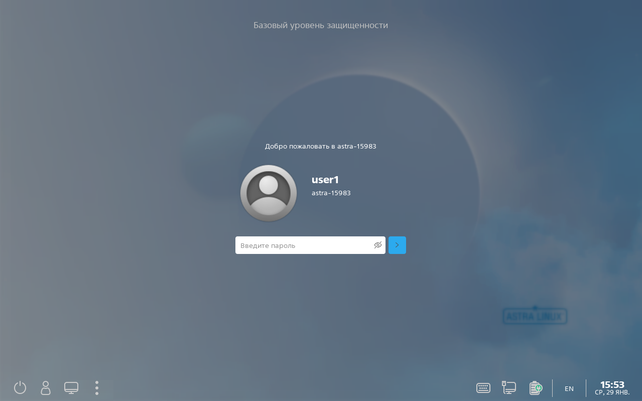 В данном разделе приведено описание экрана графического входа, используемого по умолчанию на базовом уровне защищенности. Вид экрана входа может отличаться, если заданы соответствующие настройки в модуле «Вход в систему» программы «Параметры системы» (см. справочную страницу Вход в систему).
