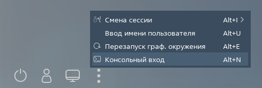 - на экране графического входа нажать комбинацию клавиш <Alt+N> или раскрыть меню Особое действие и выбрать Консольный вход;