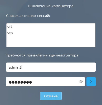 Пользователь, не обладающий правами администратора, не сможет выключить или перезагрузить компьютер, если есть активные сессии других учетных записей. При наличии активных сессий выключение и перезагрузка возможны только от имени администратора: необходимо ввести имя учетной записи и пароль администратора, затем нажать [>].