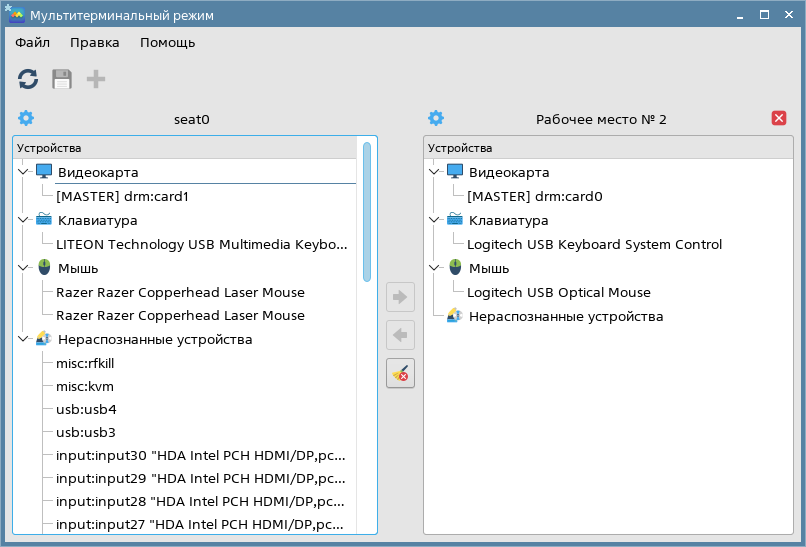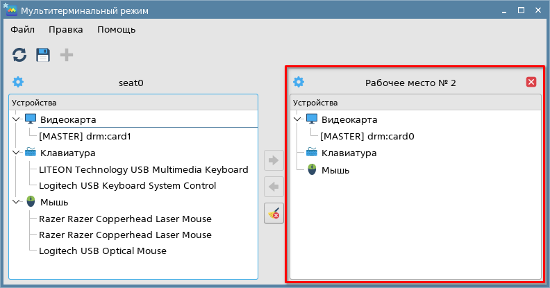 Возможно добавить дополнительное рабочее место без устройств ввода. Для этого необходимо в меню Правка установить флаг Разрешить места без устройств ввода, затем добавить дополнительное рабочее место (см. Добавление рабочего места). Для использования рабочего места возможно присоединение к нему устройств ввода с другого рабочего места (см. Присоединение и отсоединение устройств).