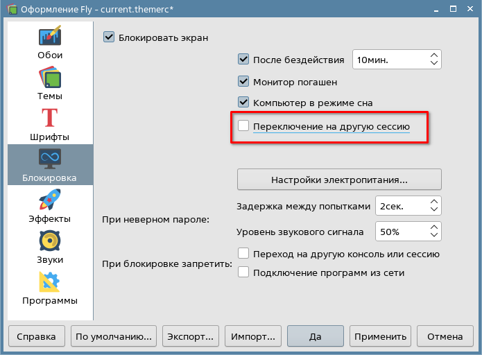 Для одновременной работы на компьютере в сессиях пользователей должна быть отключена блокировка экрана при переключении между сессиями. Для этого необходимо в программе «Оформление Fly» снять флаг Переключение на другую сессию (см. справочную страницу Оформление Fly).