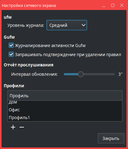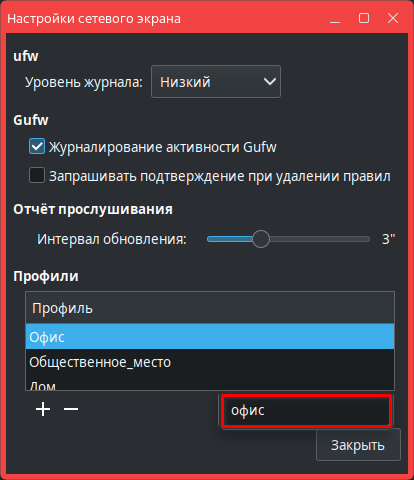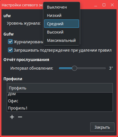 - в открывшемся окне Настройки сетевого экрана установить флаг Журналирование активности Gufw;