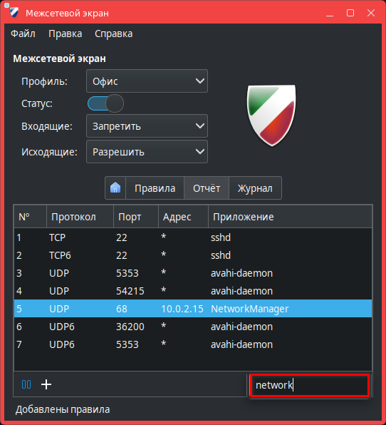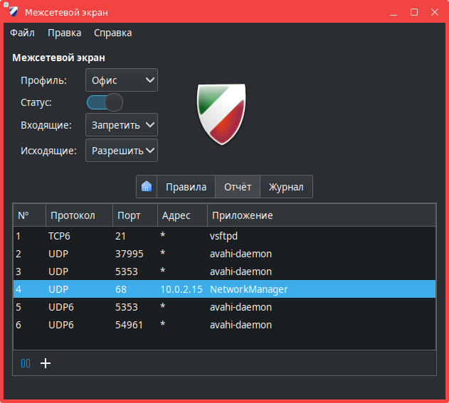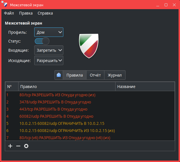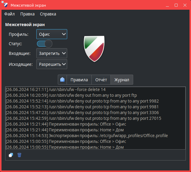 Регистрируемые события записываются в журнал /var/log/ufw.log. Журнал возможно посмотреть в программе (см. Просмотр журнала в окне программы).