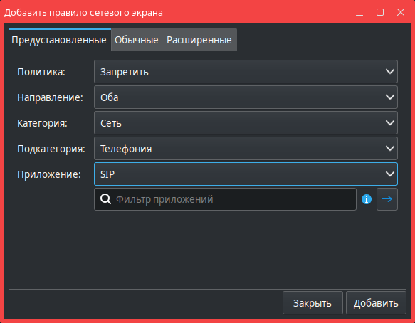 Предустановленные правила позволяют задать правила фильтрации трафика для часто используемых программ и служб. Правила применяются к текущему профилю.