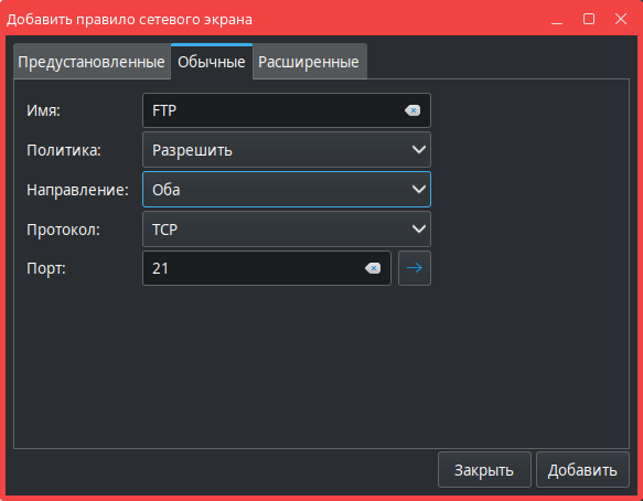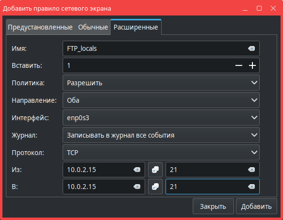 ВНИМАНИЕ! Расширенные правила возможно добавить только при включенном межсетевом экране.